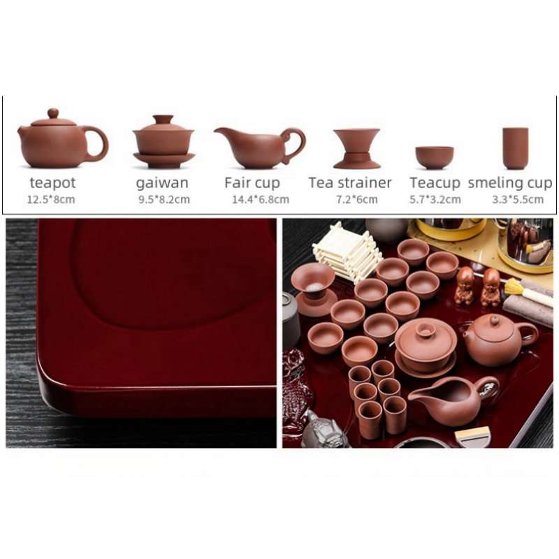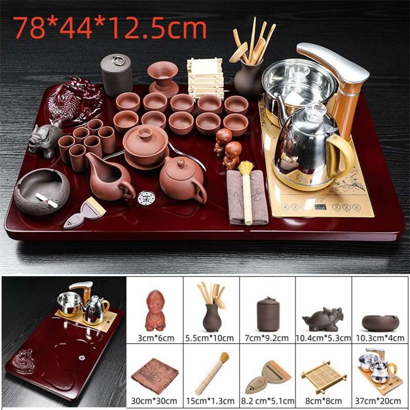 This elegant set includes: 1 Teapot (12.5cm*8cm,200ml/6.8 fl oz), 1 Gaiwan (9.5cm*8.2cm,130ml/4.4 fl oz),1 Fair Cup(14.4cm*6.8cm,150ml/5.1 fl oz),8 Tea Cup(5.7cm*3.2cm,50ml/1.7 fl oz), 6 Aroma Cup(3.3cm*5.5cm,25ml/0.85 fl oz), 1 Tea Tray (78cm*44cm*12.5cm), 1 Tea Utensils Sets(5.5cm*10cm), 1 Tea Infuser(7.2cm*6cm), 1 Tea Caddy(7cm*9.2cm), 1 Tea Scraper(8.2cm*5.1cm), 1 Automatic filling water bottle(37cm*20cm), 1 Ashtray(10.3*4cm),2 Tea Pet (3cm*6cm), 1 Teapot Maintenance Brush(15cm*1.3cm), 1 Tea Towel (30cm*30cm), 1 Yixing Clay Dragon Turtle (10.4cm*5.3cm), 2 Coaster (8cm*8cm).Find more copper teapots.