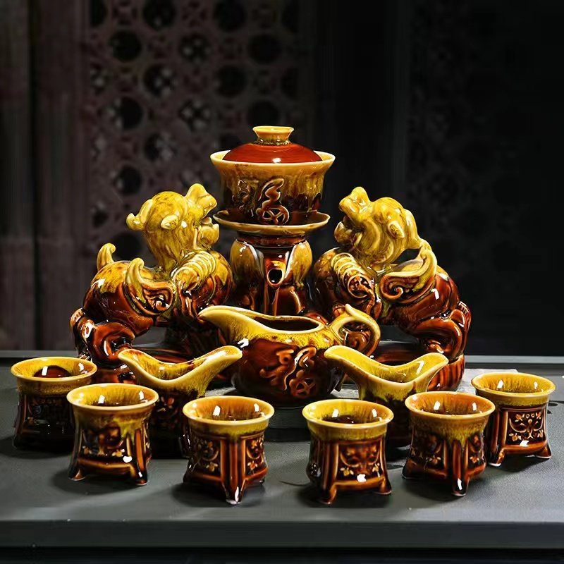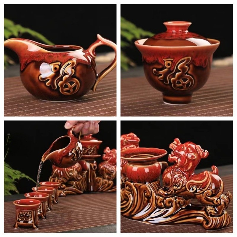 This Red Glaze Ceramic Lazy Semi Automatic Tea Set with Two Pi Xiu Symbol of Luck is available in 2 colors: Red and Yellow. The set includes: 6 Teacups (5.5 cm*5 cm,1.7 fl oz),2 Master Cup(8 cm*6.8 cm,1.7 fl oz), 1 Gaiwan with Base (Gaiwan: 9 cm*8.5 cm, 5.7 fl oz,Base: 29 cm*15 cm),1 Fair Cup (13 cm*7 cm,5.7 fl oz).Find more Japanese tea set.