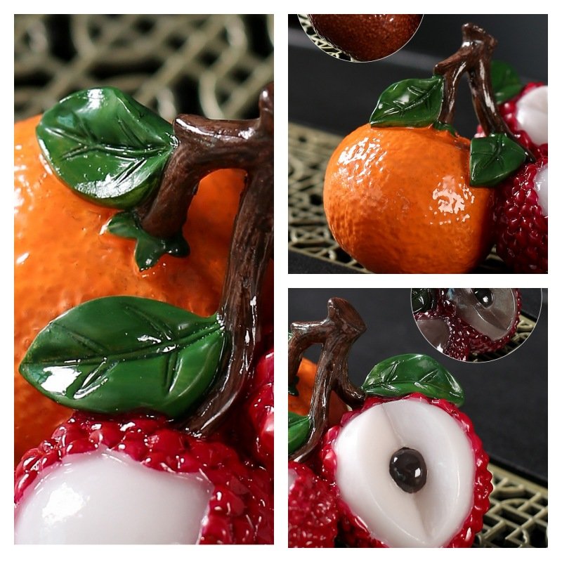 Resin Orange And Lychee Chinese Tea Pet Color Changing For Good Meaning,This delightful tea pet, designed in the shape of an orange and lychee, is a beautiful embodiment of Chinese cultural symbolism, representing prosperity, good fortune, and happiness. The orange and lychee are symbols of abundance and success, cherished in Chinese culture as they signify growth and positive energy. Made from high-quality resin with incredibly realistic details, this tea pet adds a vibrant aesthetic to any Gongfu tea ceremony. Its textures mimic the natural look of real fruit, from the smooth and glossy surface of the orange to the intricate, bumpy texture of the lychee, creating a delightful visual impact that brings life and joy to your tea setup. When warm water is poured over it, the tea pet undergoes a mesmerizing color transformation, enhancing its natural hues and bringing a lifelike quality to the fruits. This interactive feature adds a layer of engagement to your tea experience, making each session a unique and memorable occasion as you witness the lively color shift with every pour.