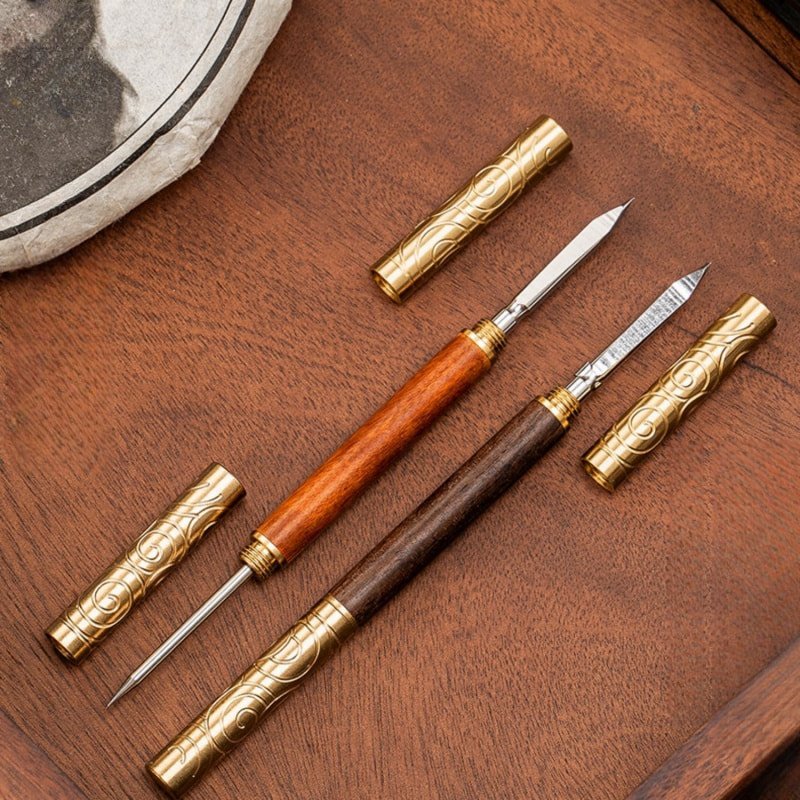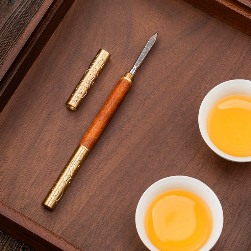 Sandalwood And Blackwood Dual-Use Copper Tea Cake Knife And Tea Needle For Sale.This tool seamlessly blends traditional materials with modern craftsmanship, featuring an elegant combination of sandalwood, blackwood, and copper. The natural grains of the woods are beautifully complemented by the polished copper accents, which not only provide an aesthetic charm but also enhance the tool’s durability and longevity. The dual-use design offers versatility by allowing the user to easily and efficiently separate tea cakes with the knife’s sharp blade while gently prying apart compressed pu erh or other tea leaves with the fine needle.Designed for both beauty and practicality, the Sandalwood and Blackwood Dual-Use Copper Tea Cake Knife and Tea Needle provides comfort and ease of use. The ergonomic handle is designed to fit comfortably in your hand, providing a secure and stable grip, which is essential when performing the delicate task of cutting or prying apart compressed tea cakes. The tool’s high-quality craftsmanship means that it will remain a reliable part of your tea preparation toolkit for years to come. Copper accents further improve the structural integrity, ensuring that this dual-use tool not only meets the high standards required for tea preparation but also withstands frequent use.