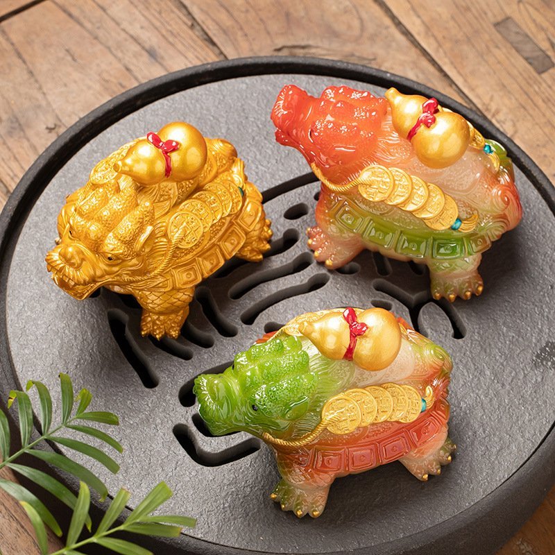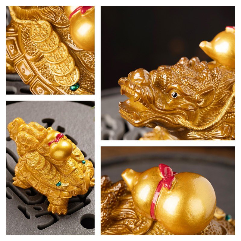 Small Antique Dragon Turtle Resin Chinese Tea Ceremony Gongfu Color Changing Tea Pet. This unique tea pet embodies the dragon turtle, a legendary creature revered in Chinese folklore for its symbolism of strength, protection, and longevity. Beautifully crafted from high-quality resin, this tea pet features an impressive array of intricate details, from lifelike scales and finely carved symbols to the golden gourd and coins resting on its back. These elements are not mere decoration; each detail holds meaning, with the gourd symbolizing health and longevity, while the coins represent wealth and prosperity. As you pour warm water over this dragon turtle, it undergoes a mesmerizing color transformation, bringing an interactive and enchanting quality to your tea ritual. This magical effect creates a peaceful ambiance, drawing you into the moment as you enjoy your tea.