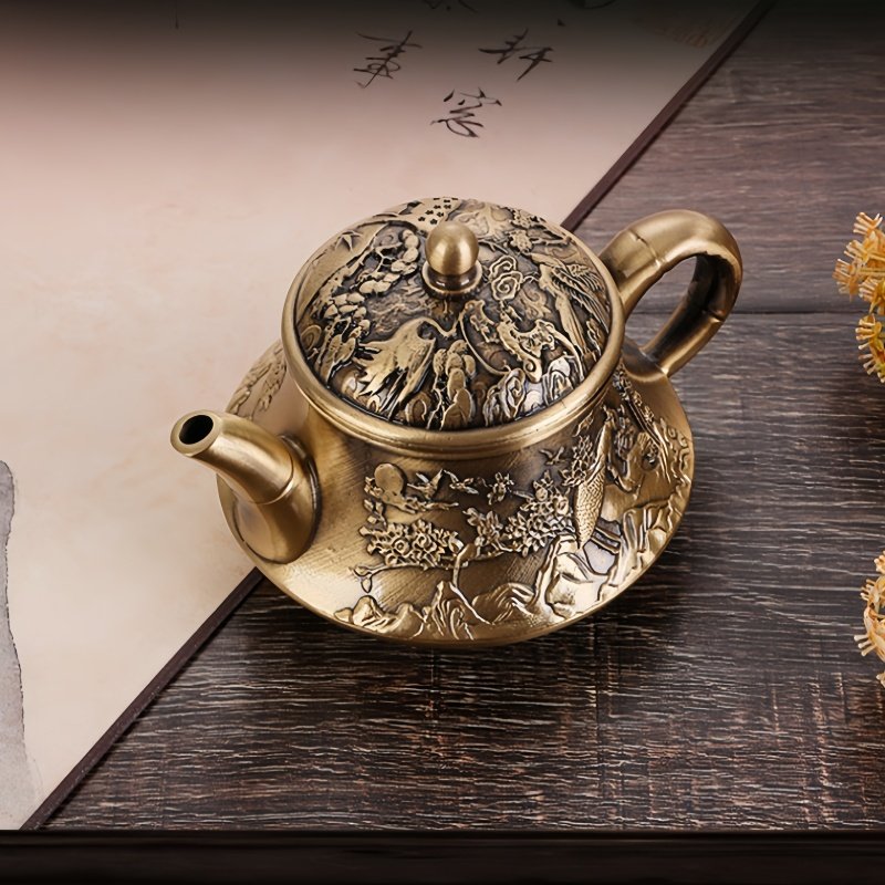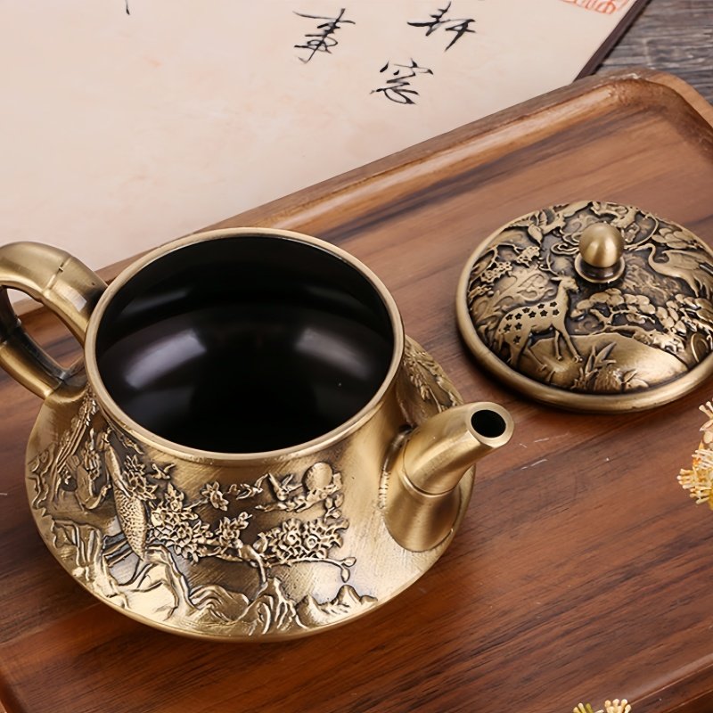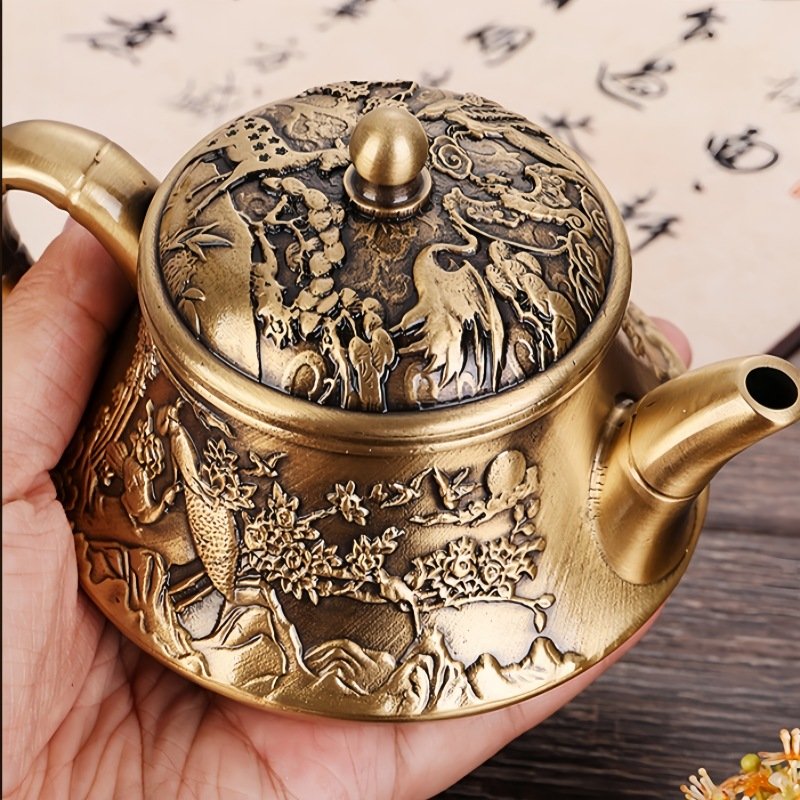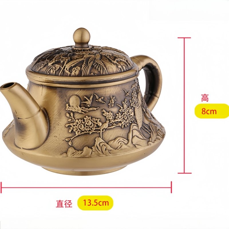 Small Embossed Landscape With Crane Pattern Brass Teapot Antique,Discover the elegance and traditional artistry of the Small Embossed Landscape With Crane Pattern Brass Teapot Antique. This exquisite teapot is handcrafted with intricate embossed patterns, showcasing serene landscapes and majestic cranes—symbols of peace, longevity, and harmony. Each detail on the teapot is meticulously carved, bringing the scenes to life, while the lustrous brass finish gives it a refined and antique charm. The compact yet eye-catching design makes it perfect for both tea brewing and as a decorative piece, elevating the ambiance of any tea ceremony. With a sturdy handle and a finely designed spout, the teapot provides a smooth, drip-free pouring experience, enhancing your overall tea experience.Find more tea cup and saucer set.