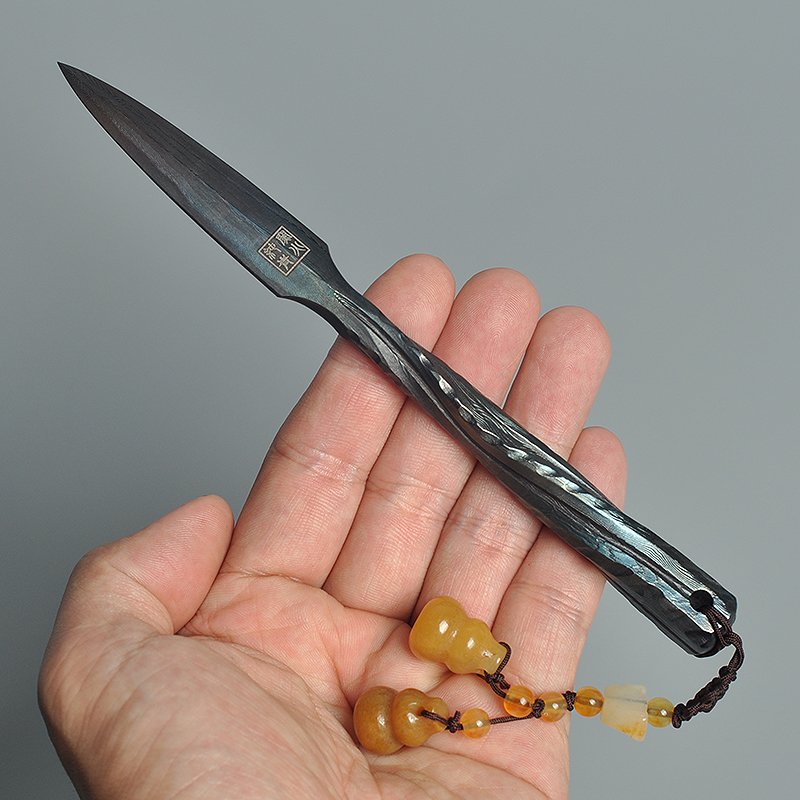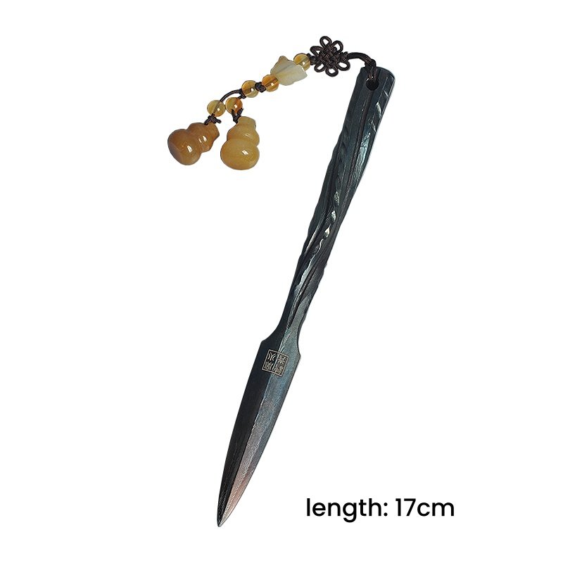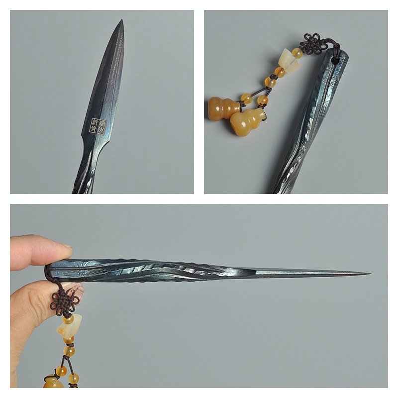 Traditional Handmade Antique Steel Tactical Tea Ceremony Knife With Tassel For Sale. With its sharp, hand-forged antique steel blade, it is specially crafted to break apart dense compressed tea cakes or bricks, ensuring that you get the perfect serving size for brewing. This knife makes the process effortless, allowing you to enjoy your tea without the struggle of breaking apart the tea leaves by hand.The blade of the knife is forged from high-quality antique steel, which not only offers superior cutting ability but also showcases a unique, rustic charm that reflects centuries of traditional craftsmanship. Each knife has its own distinct features, adding to its appeal as both a practical tool and a beautiful decorative piece. The blade maintains a sharp edge, capable of cutting through tea cakes with ease, while its unique design adds a touch of sophistication to your tea ritual. The precision with which the knife is crafted allows for a clean, accurate cut every time, ensuring that you can prepare your tea leaves without damaging them.The combination of the knife’s sleek design, functional features, and artistic craftsmanship makes it a versatile tool that can be used for a wide variety of tea preparation tasks. The carefully balanced weight of the knife ensures that it feels comfortable in your hand, while the traditional handcrafting process ensures that each knife is unique.
