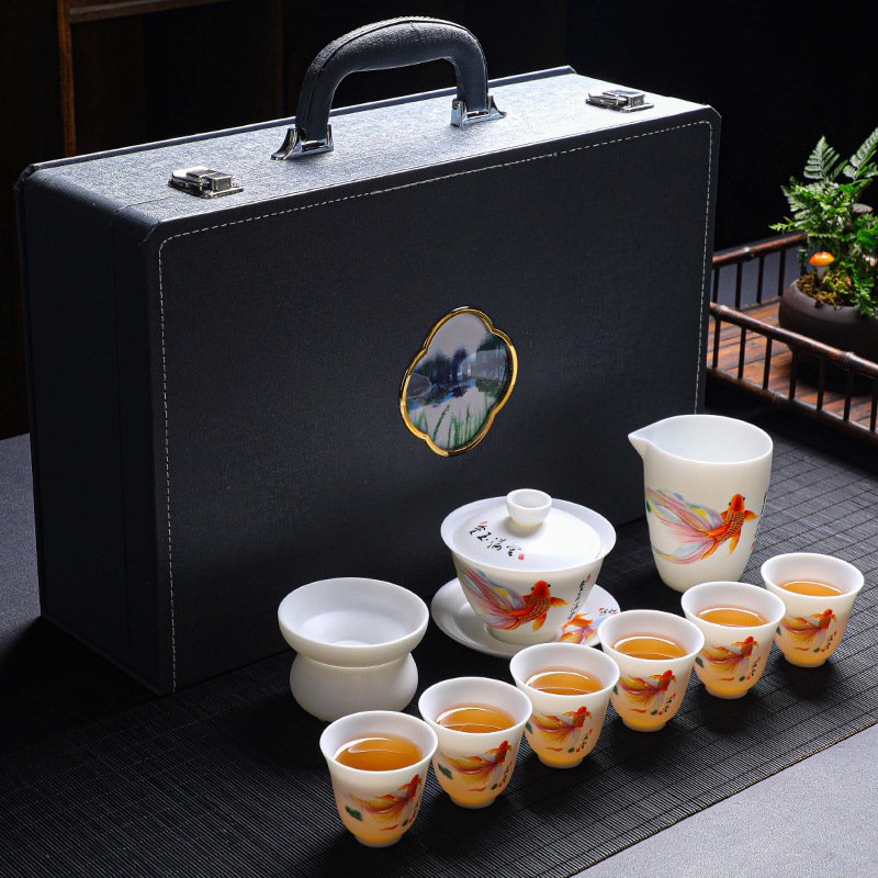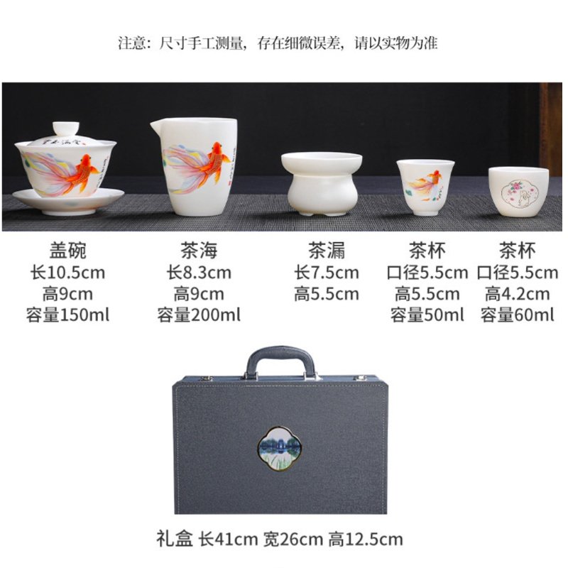 This Traditional Mutton Fat Jade White Porcelain Gold Fish Theme Chinese Tea Service Set includes: 1 Gaiwan(10.5 cm*9 cm,150 ml),6 Teacups(6.3 cm*5 cm,60 ml),1 Fair Cup(8.3 cm*9 cm*6 cm,200 ml),1 Tea Infuser(7.5 cm*5.5 cm),1 Gift Box.Find more vintage tea sets.