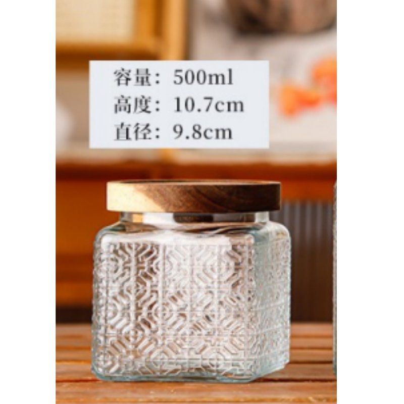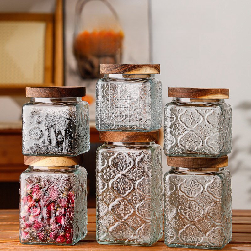Clear glass for easy viewing, Compact and stackable shape, Durable wooden lid with seal, Intricate embossed glass design, Versatile for décor and storage
