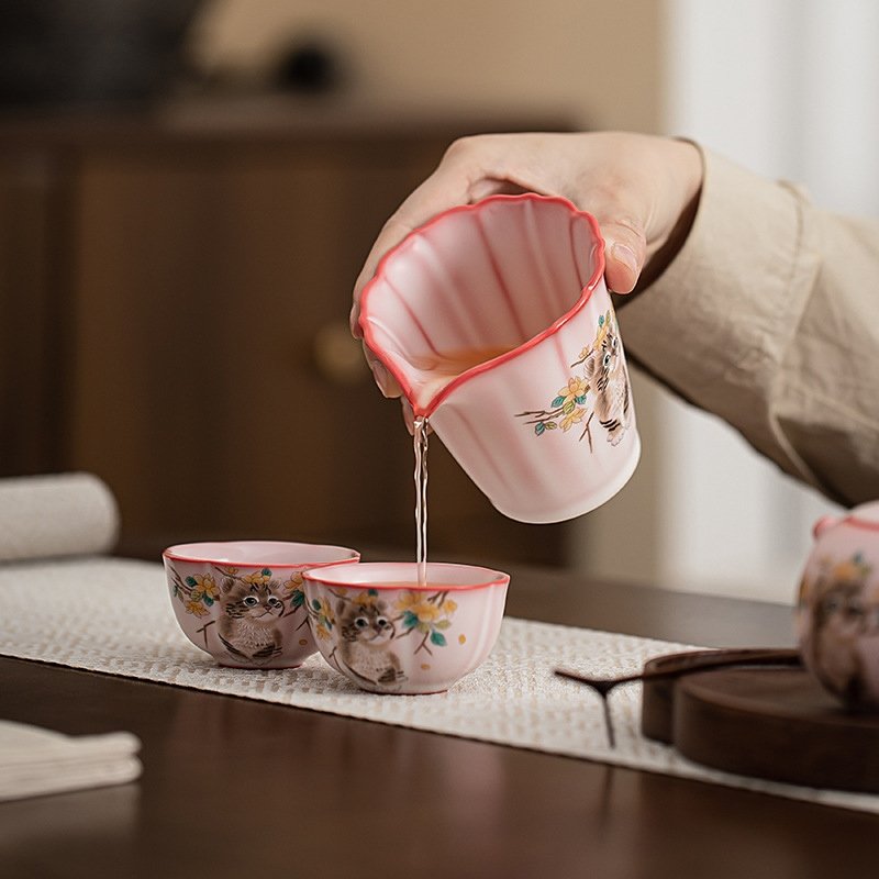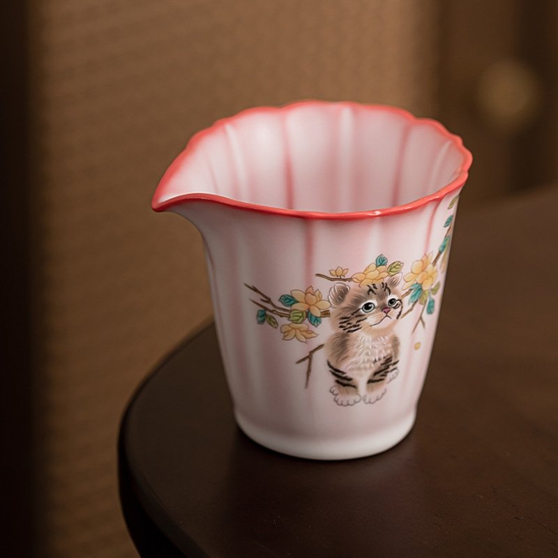 Unique Lard-Frost Glaze Yellow Flowers And Cat Pattern Pink Petal Shape Gonfu Tea Ceremony Cha Ha. This exquisitely crafted fair cup stands out as a true work of art, combining playful design with refined craftsmanship to enhance the tea experience. The Cha Hai’s soft, lard-frost glaze finish creates a smooth, matte texture that brings out the delicate pink hue, lending an air of subtle sophistication to its appearance. The petal-shaped rim not only adds a floral-inspired charm but also elevates the aesthetic appeal, capturing the essence of elegance and nature. Adorning the exterior is a whimsical hand-painted design of a small cat nestled among blooming yellow flowers, giving this Cha Hai a joyful, lively energy that brightens up each tea session. The fine details of the painting are rendered with precision and vibrant yet soft colors, celebrating the harmony between traditional craftsmanship and the lighthearted beauty of nature, making this Cha Hai a delightful visual centerpiece in any tea lover’s collection.