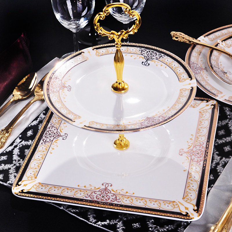 Each plate in this exquisite stand is adorned with a sophisticated golden filigree border, complemented by delicate ornamental details. These embellishments are inspired by the rich traditions of vintage design, echoing the classic charm and intricate craftsmanship of bygone eras. The golden accents beautifully contrast with the pristine white ceramic background, enhancing the aesthetic appeal and adding a touch of opulence to your table setting. This stand is not only a practical piece for serving and showcasing your treats but also a significant decorative element that captures the essence of refined tableware. It is perfect for those who cherish the art of presentation and appreciate the beauty of elegantly designed tableware.
