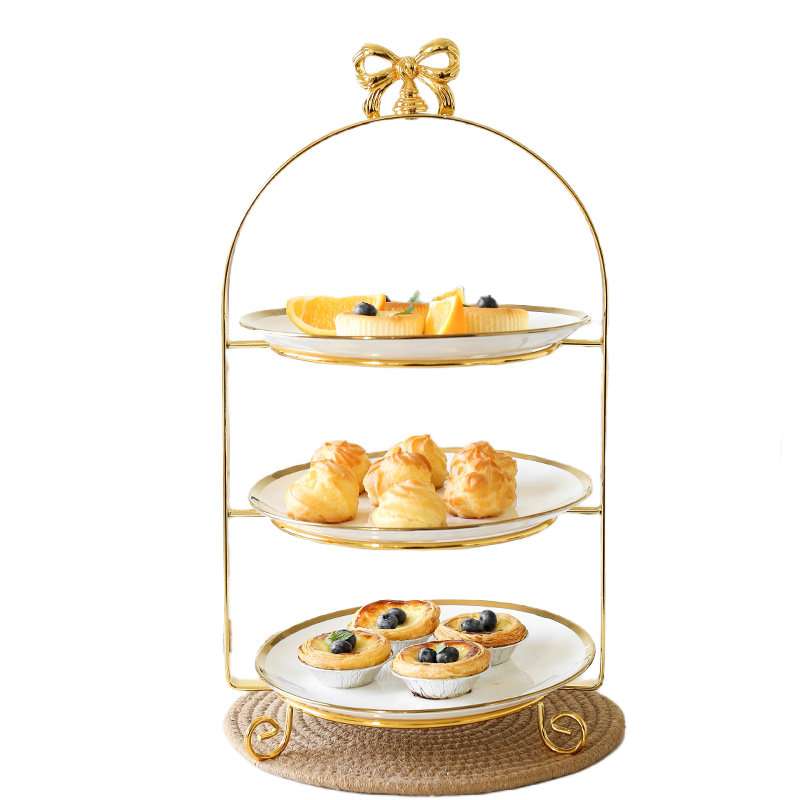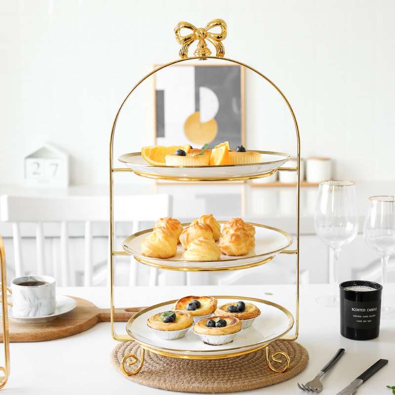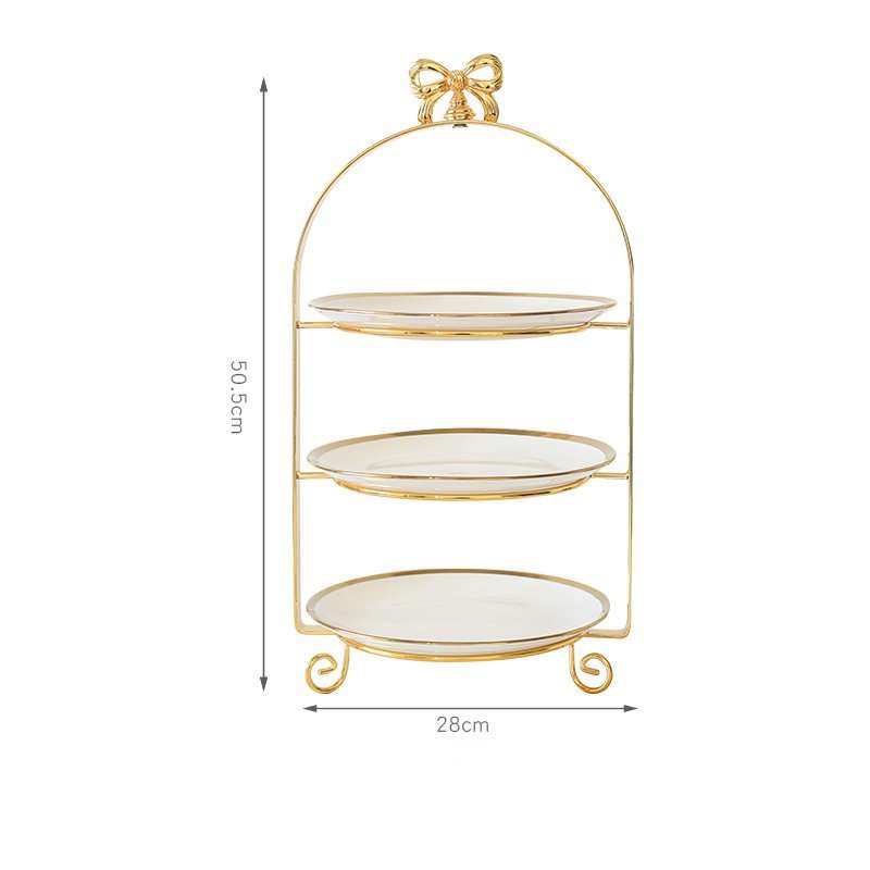 The design of the stand draws inspiration from the whimsical structure of a bird cage, featuring elegant and intricate metalwork. This metal framework adds a dramatic flair to the overall presentation, making it a striking centerpiece that is sure to captivate and impress your guests. The delicate yet sturdy metal enhances the vintage feel of the stand, while providing a strong support structure for the ceramic tiers.