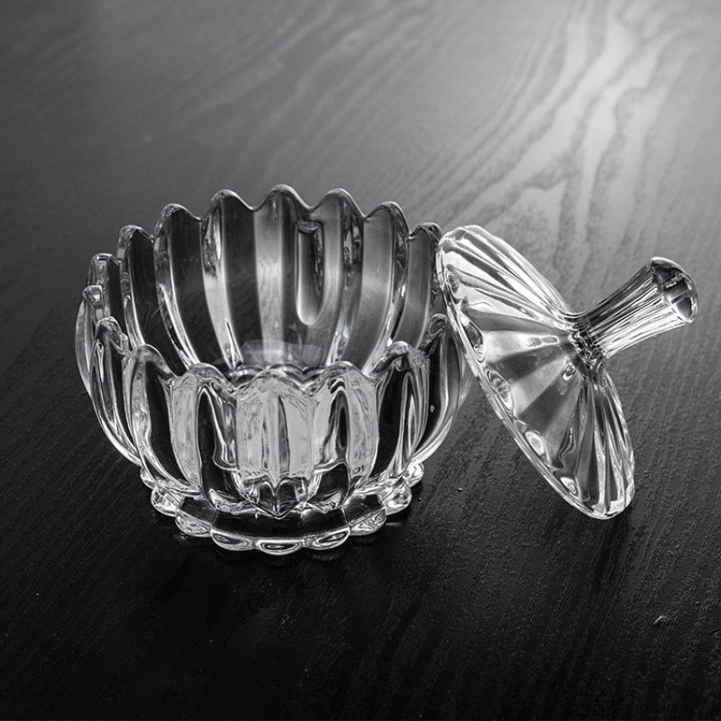 Compact Candy Storage Solution, Elegant Lotus-Inspired Design, High-Quality Durable Glass, Multi-Purpose Home Accent, Secure-Fitting Decorative Lid