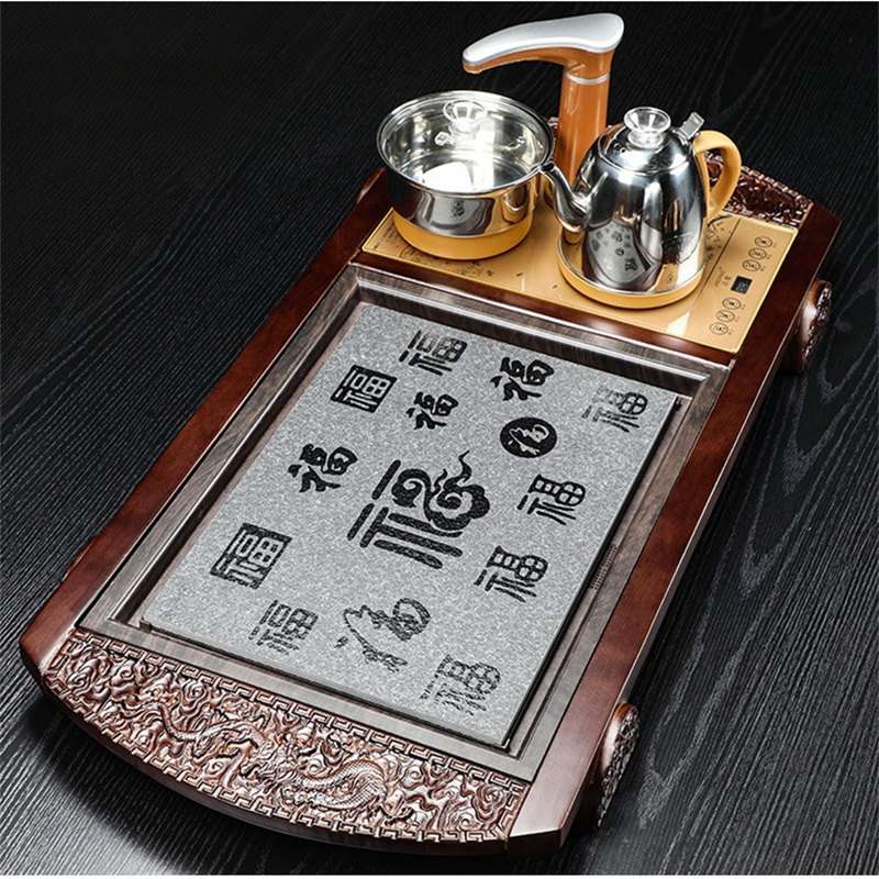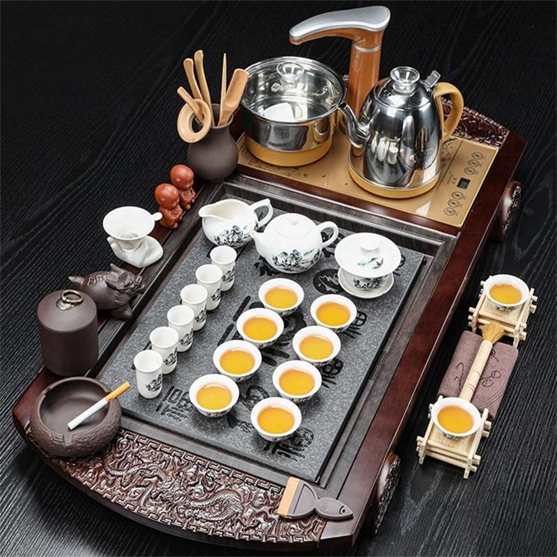 White Porcelain Gongfu Tea Set with Dragon Tea Tray and Stainless Electric Teapot with Temperature Control