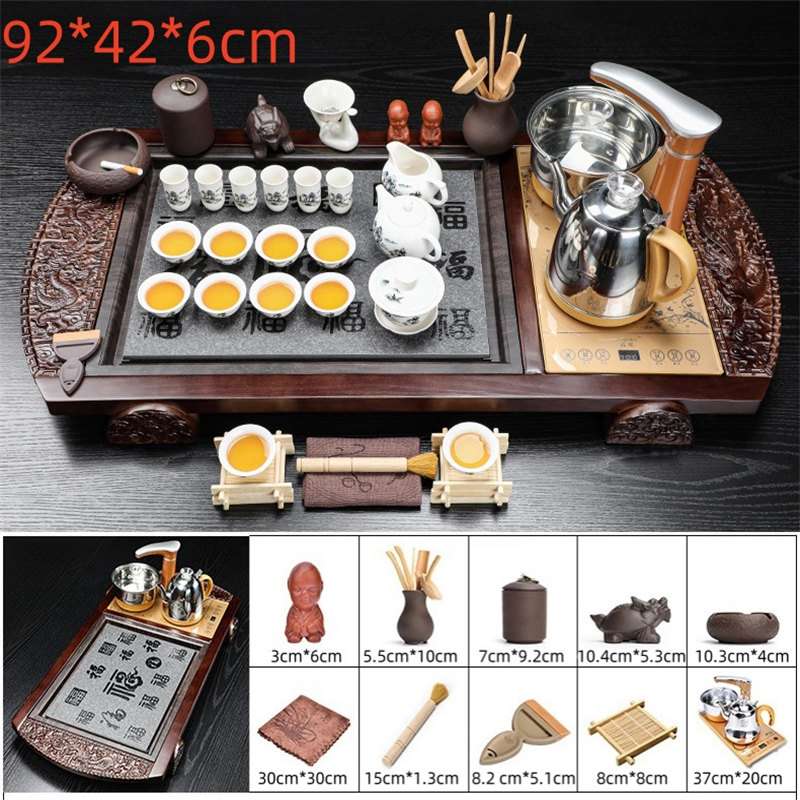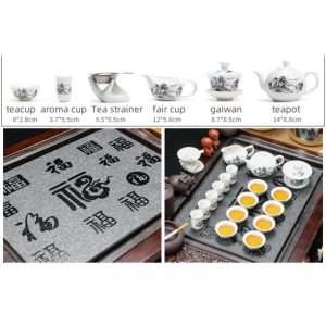 This elegant Gongfu tea set includes : 1 Teapot (14cm*8.8cm,200ml/6.8 fl oz) , 1 Gaiwan (8.7cm*8.5cm120ml/4.06 fl oz) , 1 Fair Cup (12cm*5.6cm140ml/4.7 fl oz), 8 Tea Cup (6cm*2.8cm , 30ml/1.01 fl oz ) , 6 Aroma Cup (3.7cm*5.5cm , 30ml/1.01 fl oz ) ,  1 Tea Tray ( 92cm*42cm*6cm) , 1 Tea Utensils Sets (5.5cm*10cm) , 1 Tea Infuser (9.5cm*5.5cm) , 1 Tea Caddy ( 7cm*9.2cm) , 1 Tea Scraper ( 8.2cm*5.1cm ) , 1 Automatic filling water bottle ( 37cm*20cm ) , 1 Ashtray ( 10.3*4cm ) , 2 Tea Pet (3cm*6cm) , 1 Teapot Maintenance Brush ( 15cm*1.3cm ) , 1 Tea Towel (30cm*30cm ) , 1 Yixing Clay Dragon Turtle (10.4cm*5.3cm ) , 2 Coaster ( 8cm*8cm ) .Find more turtle tea pet.